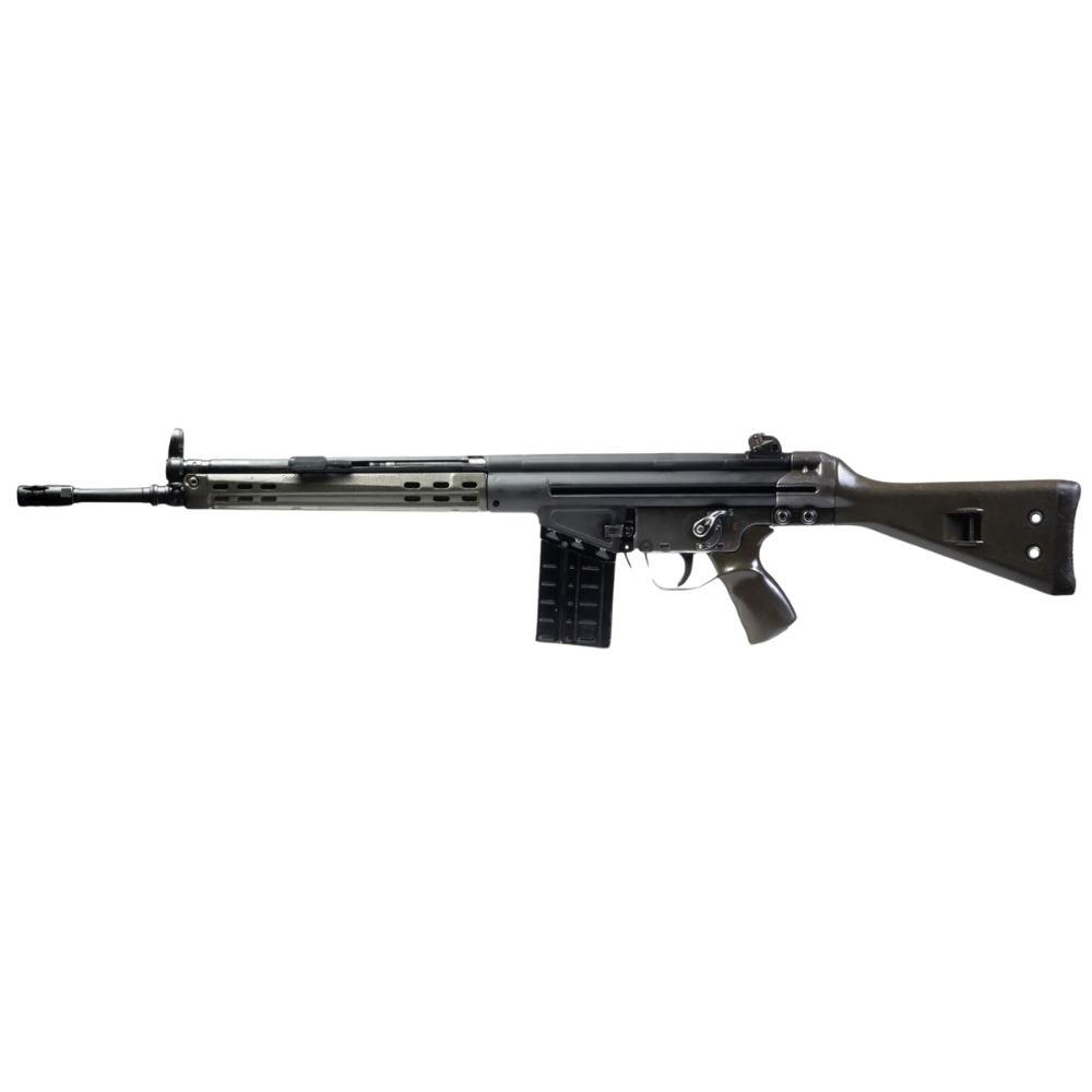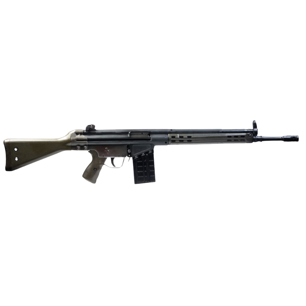 The Century Arms CA-3, assembled by PTR is a military surplus sourced G3 with a lot of original features and a configuration enthusiast have grown to love. The Century Arms CA-3 comes standard with original surplus parts including the fixed stock, forend, adjustable front sight, rotary aperture rear sight, trigger group (modified for compliance), bolt and bolt carrier. The new, American-made components by PTR include the trunnion, barrel, flash hider, stamped receiver, hammer, sear and charging handle… all made to keep the nostalgia alive with this beautiful vintage rifle.